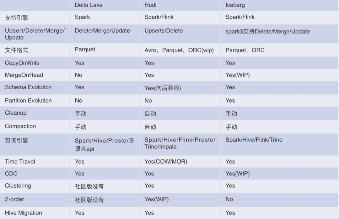 3个项目都是目前活跃的开源数据湖方案,feature to feature的展开详细说篇幅太长,大致列举一下各自的优缺点。