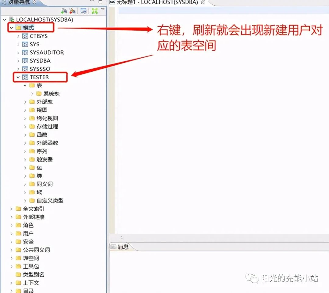 点击确认之后会在左边栏目【模式】下自动生成同名表空间(在模式上右键鼠标出现刷新并点击刷新才会出现新用户对应的表空间)。