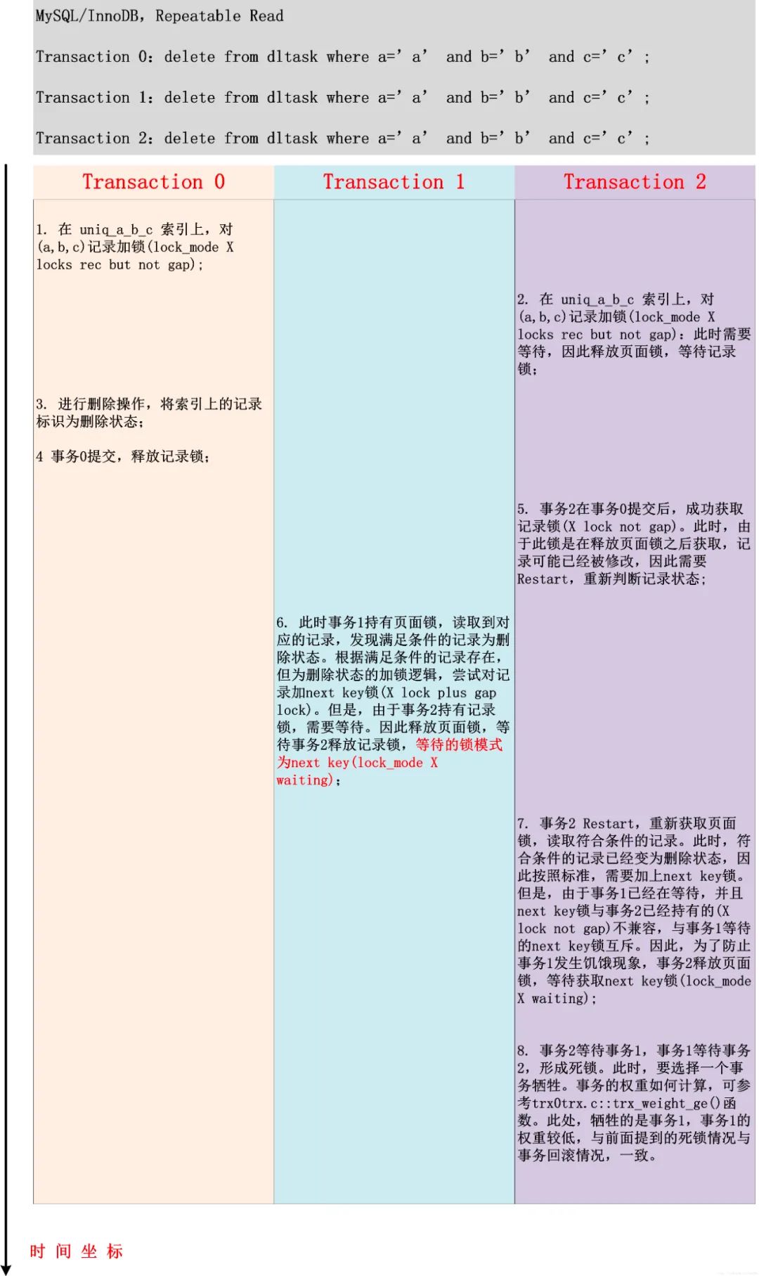 做了这么多铺垫,有了Delete操作的3种加锁逻辑、InnoDB的死锁预防策略等准备知识之后,再回过头来分析本文最初提到的死锁问题,就会手到拈来,事半而功倍。
