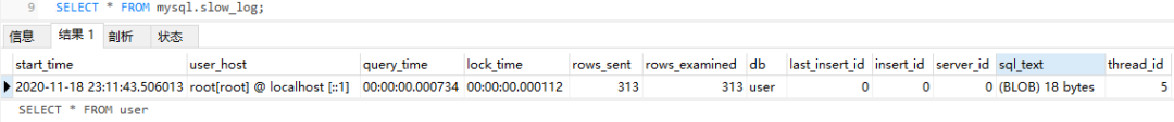 然后再查询慢查询日志:SELECT * FROM mysql.slow_log