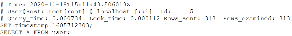 通过第二种方式开启慢查询日志,然后使用全表查询语句 SELECT * FROM user