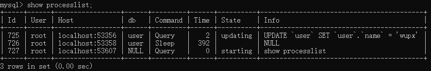 还有种情况是慢查询还在执行中,慢查询日志里是找不到慢 SQL 呢,这个时候可以用 show processlist