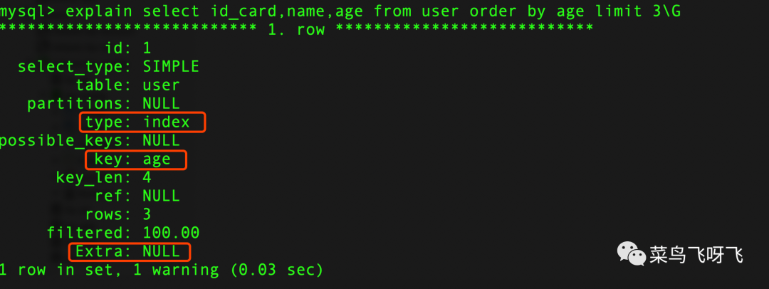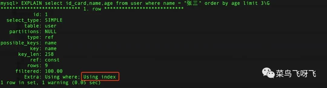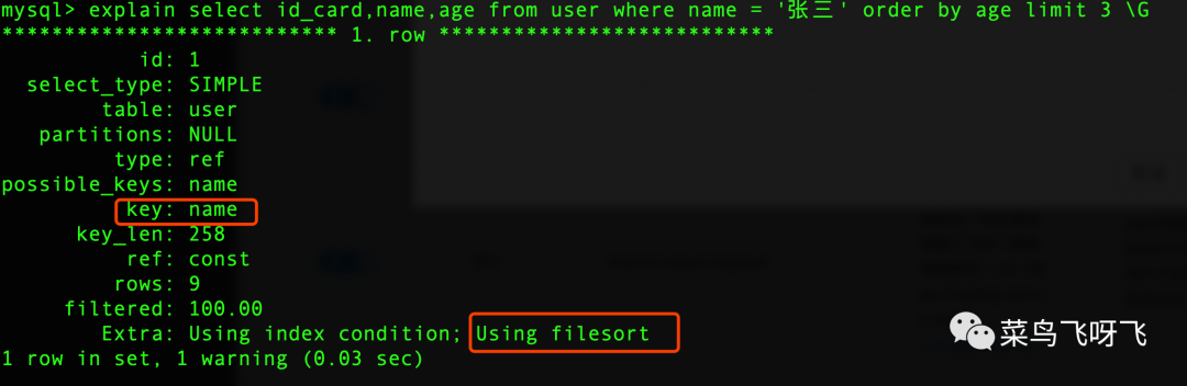 EXPLAIN select id_card,name,age from user where name = "张三" order by age limit 3\G;