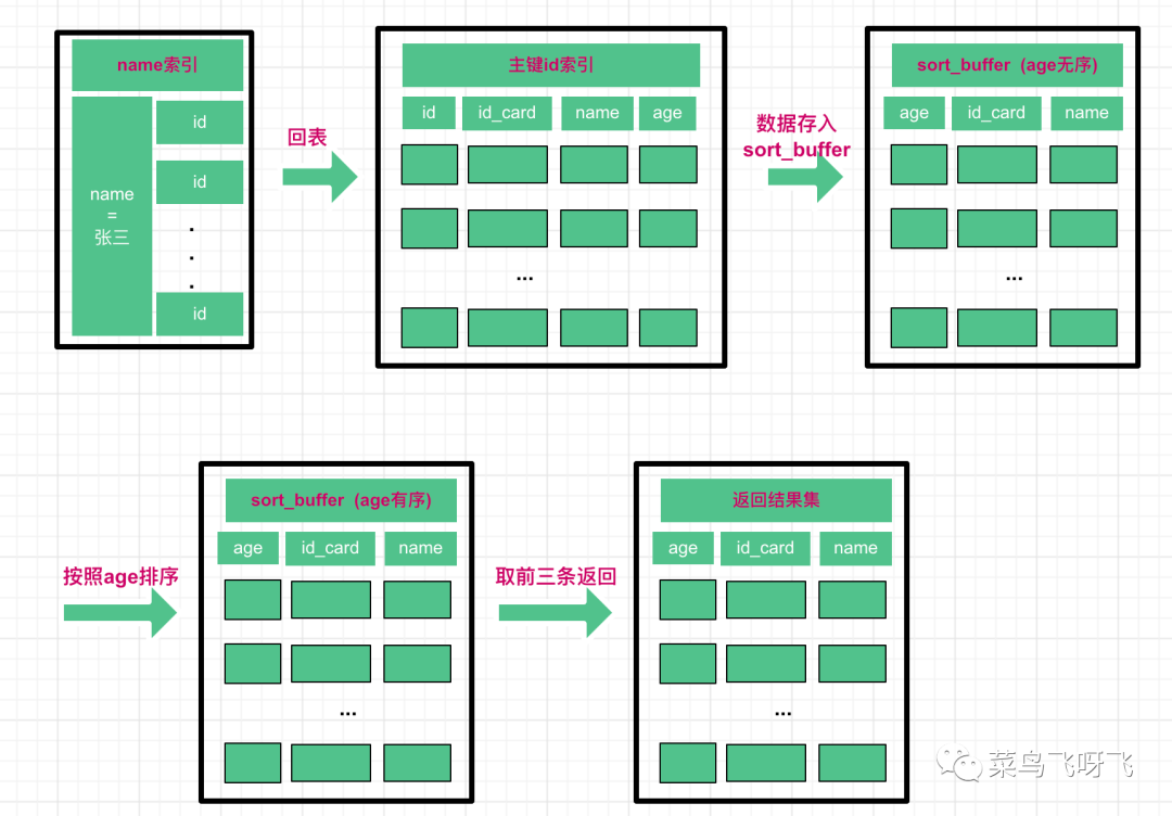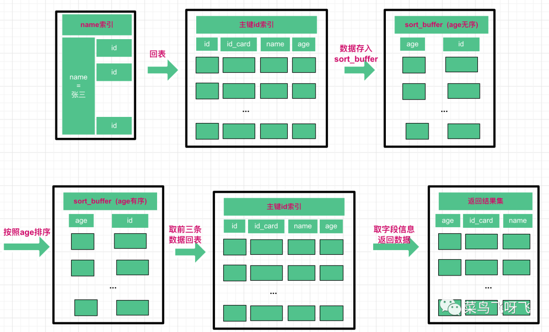 首先 MySQL 为对应的线程分配一块大小为 sort_buffer_size 的内存,然后确认要向内存中放入哪些字段,由于示例中要查询的是 id_card、name、age 这三个字段,而这三个字段的长度之和超过了 max_length_for_sort_data 的限制,所以采用 rowid 排序, 因此这块 sort_buffer 中要存放的字段是 age 和主键 id; 存储引擎先在 name 索引树中找到第一个 name="张三"的叶子结点,然后返回叶子结点中存放的主键 id 值; 根据上一步中返回的主键 id,进行回表,回到主键索引树上查找到对应 id 的记录,并取出 age 字段的值,返回给 MySQL 的 server 层,放入到 sort_buffer 中; 继续在 name 索引树中查找下一条 name="张三"的结点,重复步骤 2、3,直到在 name 索引树上找到第一条 name 不等于张三时,停止查找。 前面 4 步已经查找到了所有 name 为张三的数据,并将要排序的字段 age 和主键 id 放入到了 sort_buffer 中,接下来就是在 sort_buffer 中,将所有数据根据 age 进行排序; 从排好序的数据中,取前 3 条数据。由于我们要查询的数据是 id_card、name、age 这三个字段,此时 sort_buffer 中只有 id 和 age 字段,因此此时还需要根据取到的三条数据的 id,会到主键索引树上读取 id_card、name、age 的值; 最后将 id_card、name、age 字段的数据返回。