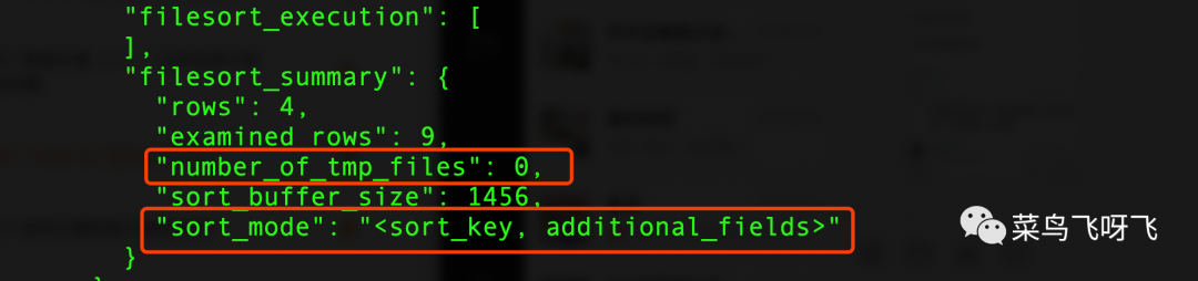 图中的 number_of_tmp_files 这一行表示的是排序时使用到的临时文件的个数,如果为 0,则表示的是本次排序没有借助磁盘文件排序,如果大于 0,则表示借助了磁盘文件排序。由于我电脑上安装的 MySQL,默认 sort_buffer_size 为 256KB,例子中查询的数据量也比较小,所以完全可以在 sort_buffer 内存中完成排序,不需要借助磁盘文件。