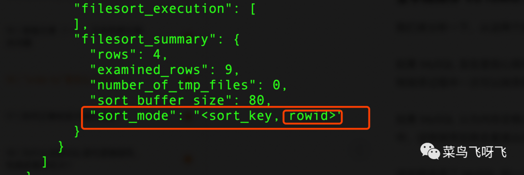 从图中我们可以看到,sort_mode 这一行显示的 rowid,这说明本次排序使用的是 rowid 排序,而对于全字段排序,则显示的不是 rowid。