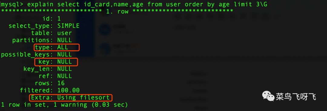 从图中我们可以发现,key 那一行的值为 null,这说明没有使用到 age 索引;type 这一行的值为 ALL,这说明进行了全表扫描;Extra 这一行的值为 Using filesort,这说明在 sort_buffer 进行了排序。