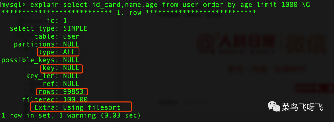 这条 SQL 语句和前面的也是类似,唯一的区别就是 limit 取了前 1000 条记录,结果我们看到执行计划的截图当中,type 为 ALL,key 为 null,这些说明这条 SQL 语句没有使用 age 索引,并且进行了全表扫描,Extra 这一行为 Using filesort,说明需要在内存中进行排序。