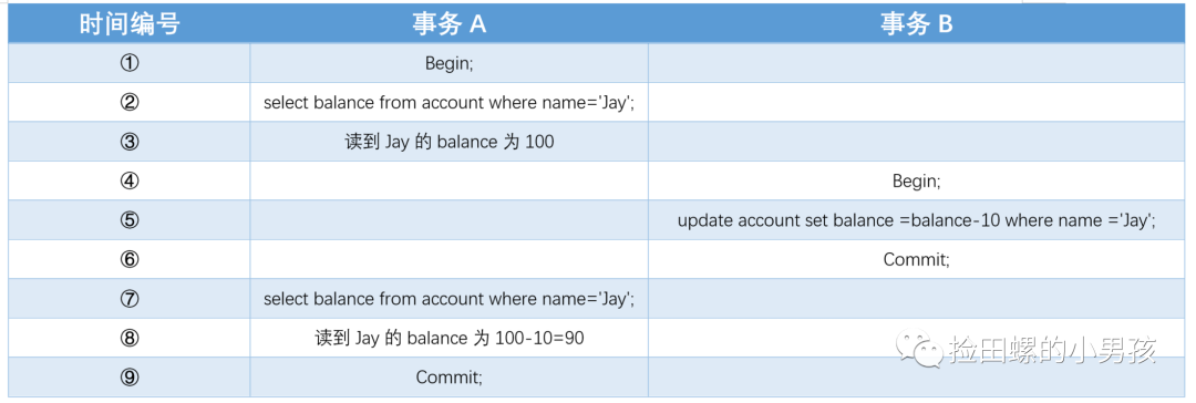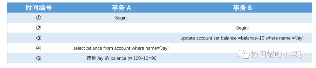 这时候事务B 对Jay的账户余额进行扣减,扣去10后,提交事务