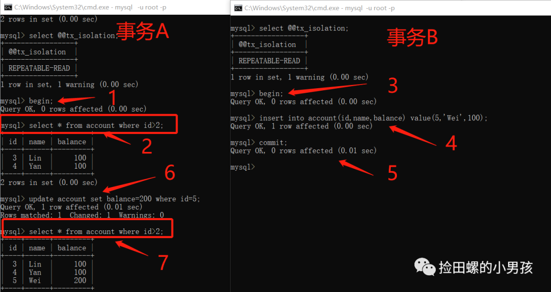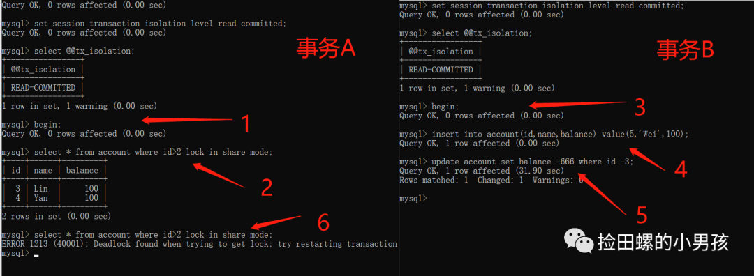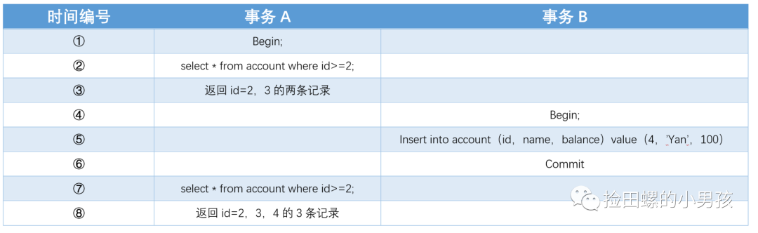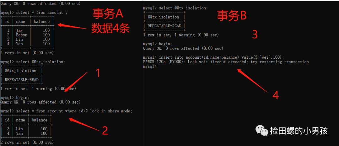 其实,上图如果事务A中,没有 update accountsetbalance=200whereid=5;