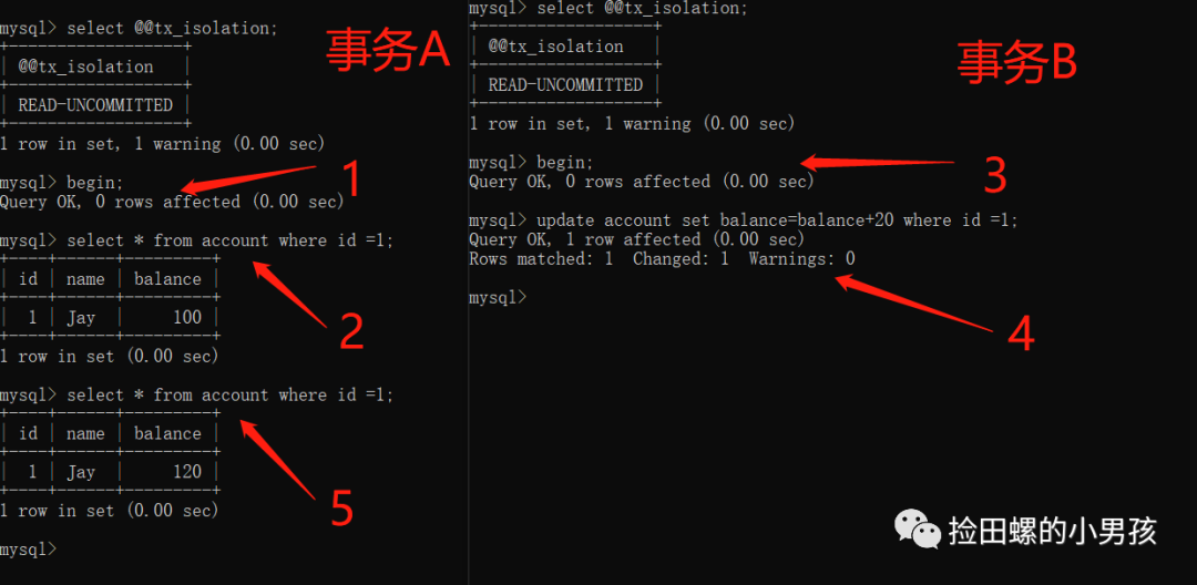 这时候,另开一个窗口打开mysql,也把当前事务隔离级别设置为read uncommitted,开启事务B,执行更新操作
