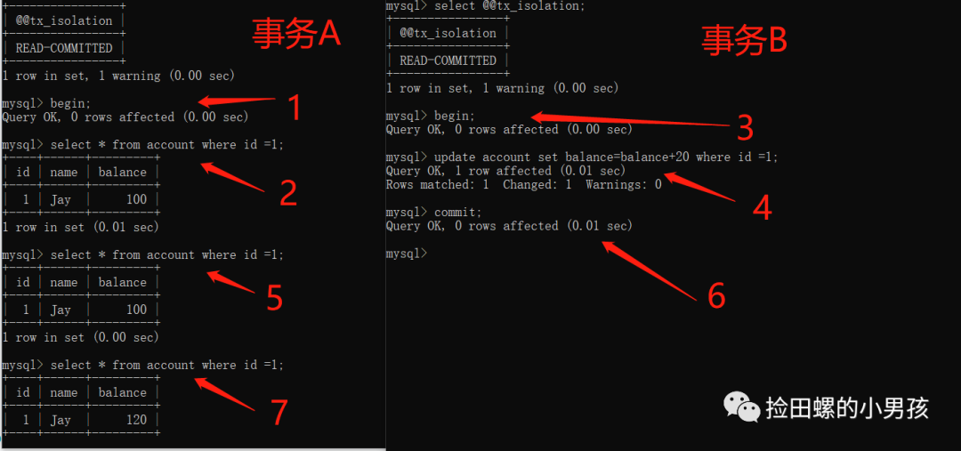 由此可以得出结论,隔离级别设置为已提交读(READ COMMITTED) 时,已经不会出现脏读问题了,当前事务只能读取到其他事务提交的数据。但是,你站在事务A的角度想想,存在其他问题吗?