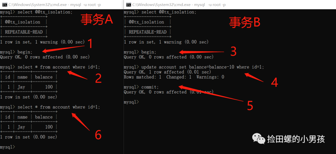 接着回事务A的窗口,再查account数据,发现数据没变: