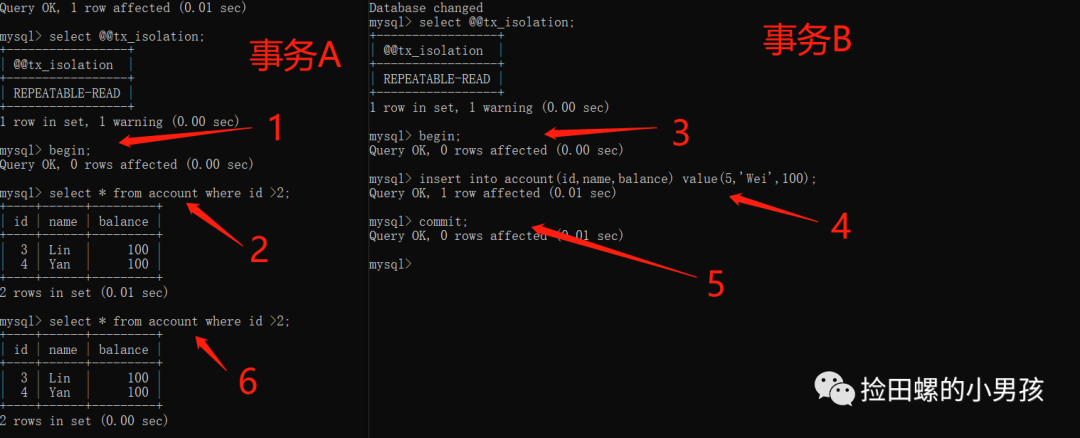 哈哈,步骤1、2、6的查询结果都是一样的,即repeatable read解决了不可重复读问题,是不是心里美滋滋的呢,终于解决老板的难题了~