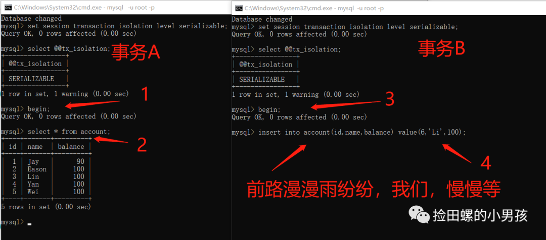由图可得,当数据库隔离级别设置为serializable的时候,事务B对表的写操作,在等事务A的读操作。其实,这是隔离级别中最严格的,读写都不允许并发。它保证了最好的安全性,性能却是个问题~