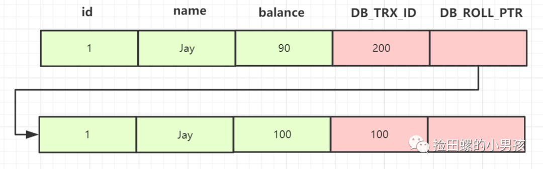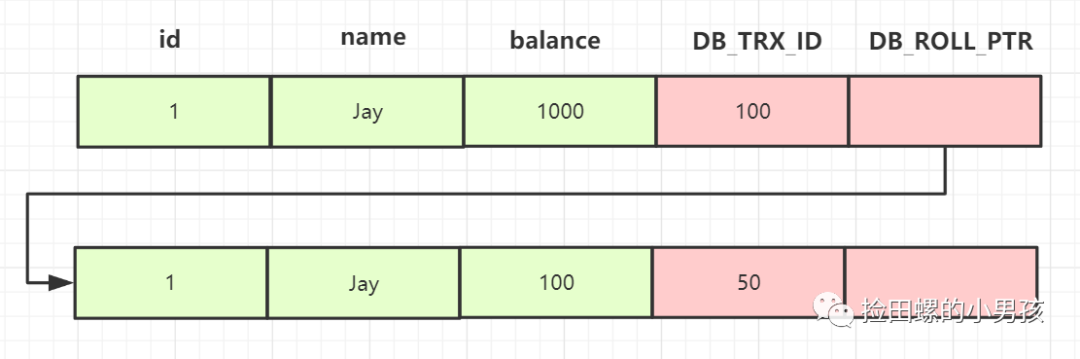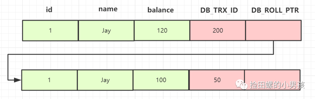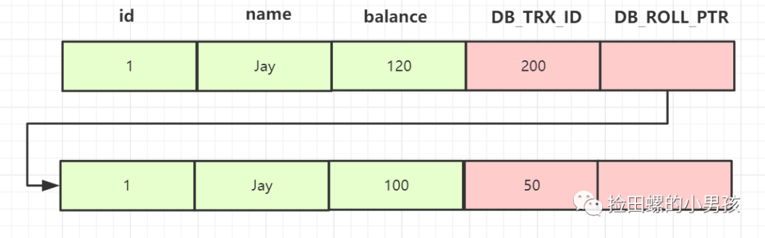 我们继续找下一个版本,balance为100这行记录,事务Id为50,小于活跃事务ID列表最小记录200,所以这个版本可见,因此,查询2的结果,就是返回balance=100这个记录~~