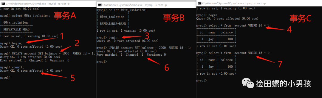 你可能会觉得两个并发事务的例子太简单了,好的!我们现在来点刺激的,开启三个事务~