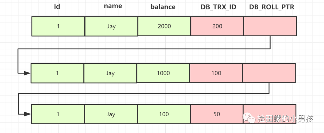 在事务B中,执行更新操作,把id=1的记录balance修改为2000,更新完后,undo 日志链如下: