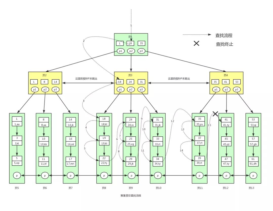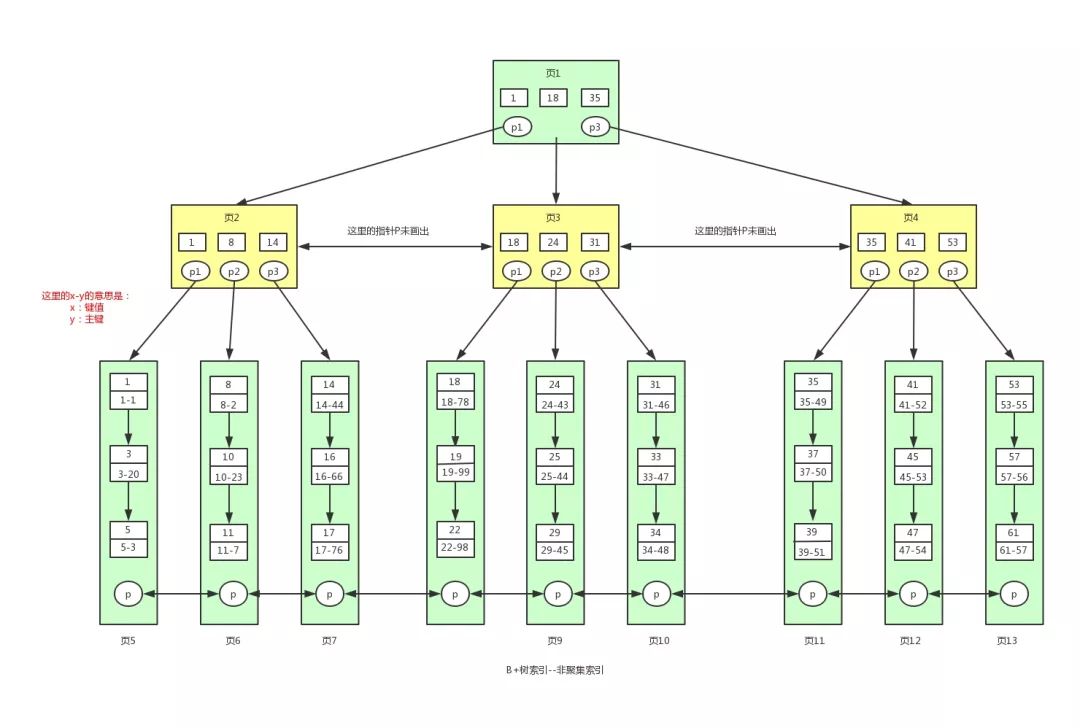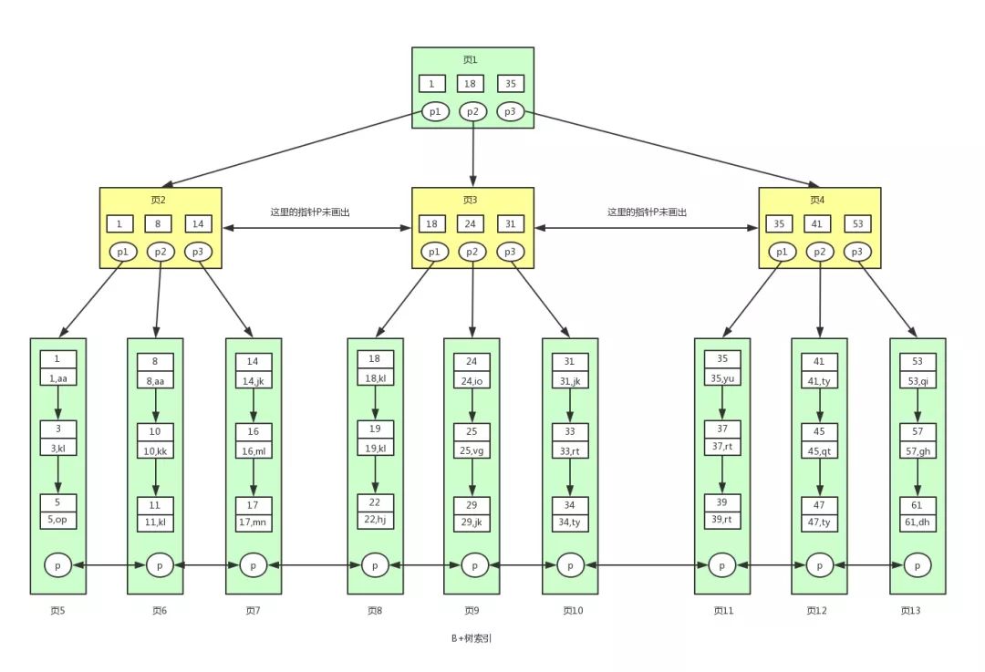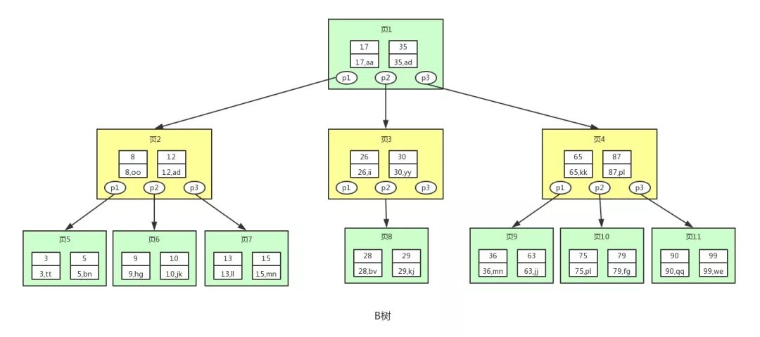 图中的p节点为指向子节点的指针,二叉查找树和平衡二叉树其实也有,因为图的美观性,被省略了。- 图中的每个节点称为页,页就是我们上面说的磁盘块,在mysql中数据读取的基本单位都是页,所以我们这里叫做页更符合mysql中索引的底层数据结构。