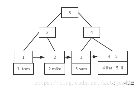假如说有如下数据,用户id为主键(1, tom),(2,mike),(3,sam),(4,lisa),(5,li)则数据是这样存储的,图1