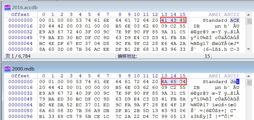 首先可以查看数据库的后缀名,2007以前的版本后缀名为.mdb,2007以后(包括2007)的后缀名为.accdb;如果软件中的数据库,后缀名被更改为dat或其他后缀名时可以通过winhex底层查看,在下图中的红框部分可以看到2016版本的和2000版本的底层不同,2007以后的版本底层的0x13-0x15都是ACE,2007以前的版本底层查看0x13-0x15都是Jet。