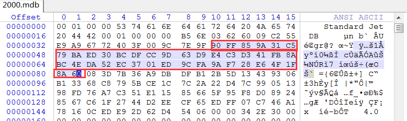 存放在数据库文件的二进制的0x42开始的后40字节为数据库的密码位,每两字节存储一个密码位,编码方式为Unicode,将加密文件中现得到的加密字节与未加密文件(没有加密的Access文件)的相应字节再进行一次异或即可得到密码原文。(下图红框中为数据库的加密位)