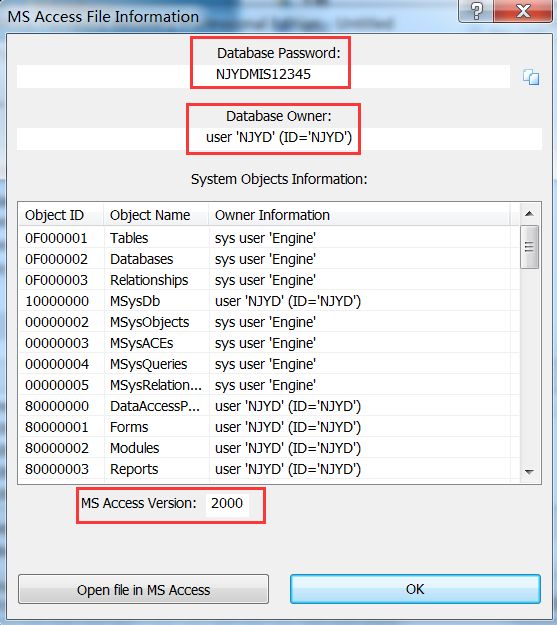确定电脑中Access数据版本为2007以前的版本后使用软件使用Advance office password recovery professional 软件破解出该数据库的密码,在软件中可以知道数据库密码为NJYDMIS12345;数据库所有者为NJYD;数据库的版本为2000。