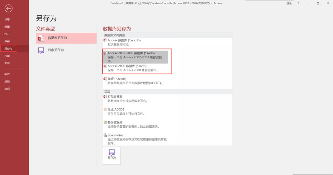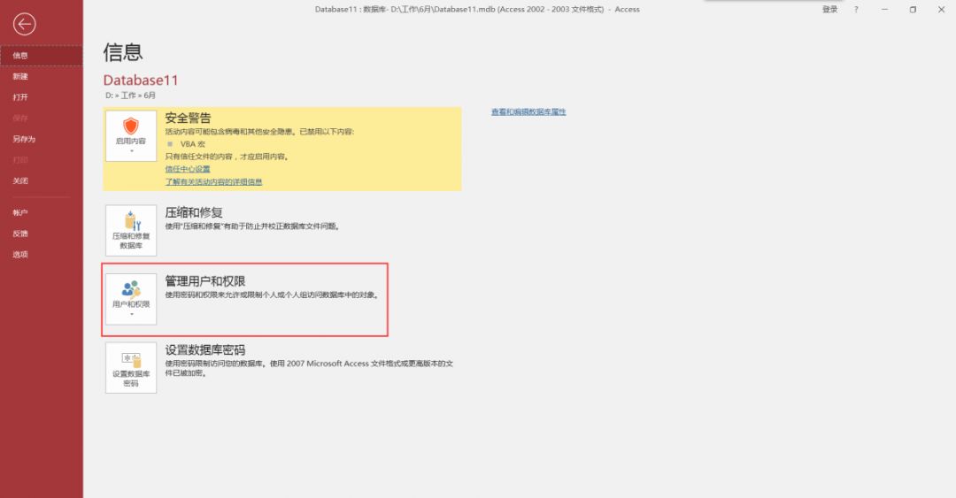先新建一个空白的数据(图1);然后另存为该数据库为Access2002-2003或者是Access2000(图2);打开新建的数据库在信息中打开管理用户和权限并添加我们再第一步中破解的用户名NJYD(图3,图4)。