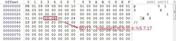 安装在目标电脑上的MySQL版本号需要和镜像中的MySQL数据库版本相同, 确定MySQL数据库版本的方法:使用winhex打开任意一个提取到mysql数据库中的.frm文件,如图所示: