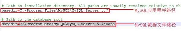 1)修改MySQL数据库的C:\ProgramData\MySQL\MySQL Server 5.7中的my.ini配置文件,然后将修改好的my.ini复制到C:\Program Files\MySQL\MySQL Server 5.7中;如图所示将配置文件中的basedir修改为MySQL数据库应用程序所在路径,datadir修改为MySQL数据库数据文件存放路径: