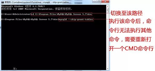 2)在cmd命令行中切换至C:\Program Files\MySQL\MySQL Server 5.7\bin路径,关闭mysql服务执行命令mysqld --skip-grant-tables,该命令的作用是跳过用户验证。注意在执行了该命令后此cmd命令行无法继续操作了,需要重新打开一个cmd命令行切换到bin路径下;