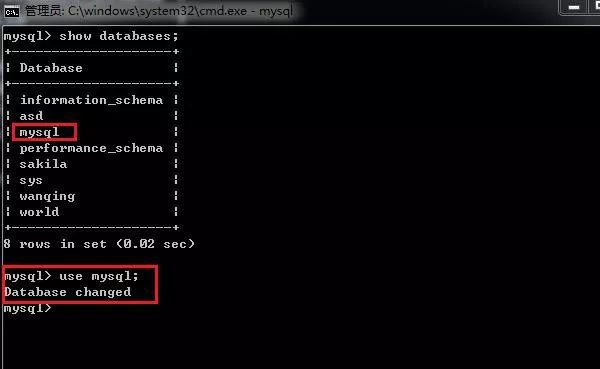 5)其中MySQL库就是保存用户名的地方。输入use mysql;选择mysql数据库;