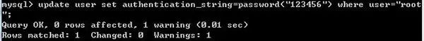 6)更改root密码;MySQL版本高于5.7.1输入update user set authentication_string=password("123456") where user="root";