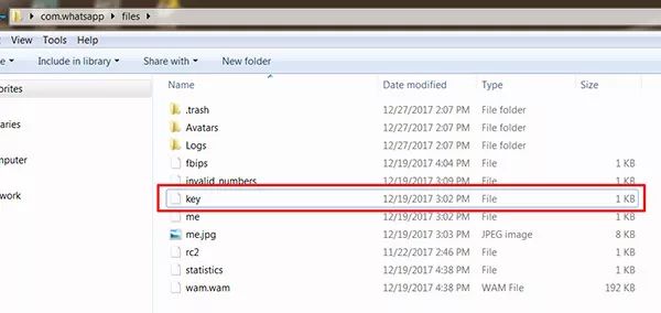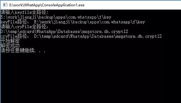 最关键的是获取到key文件。key文件是和备份同时生成的密钥文件,并且key文件因手机设备而异。所以要想解密数据库,必须首先从生成备份的手机上获取到key文件,其存储路径为:userdata/data/com.whatsapp/files/key。