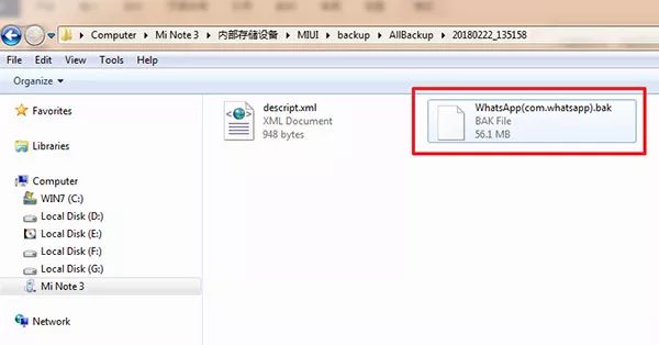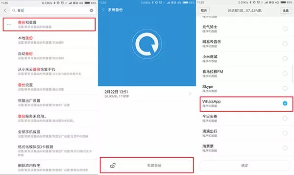 下图展示的是以小米手机为例的备份操作过程:找到并打开备份功能,创建一个新的备份,确保勾选备份WhatsApp且不要设置备份密码。