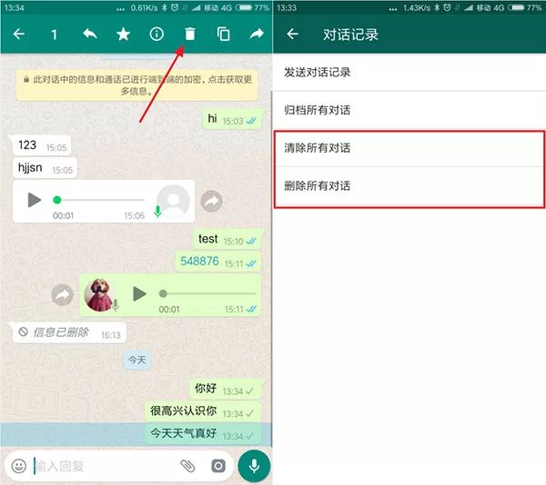 首先我们需要了解,删除WhatsApp消息的方式有两种。一种是长按一条或多条消息并点击删除以逐条删除,另一种是在设置中一键清除/删除所有聊天消息。