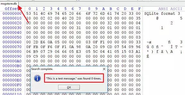 例如消息“This is a test message”,在消息被删除后,很多时候其对应的在msgstore.db数据库中的记录也可能被清除掉了。