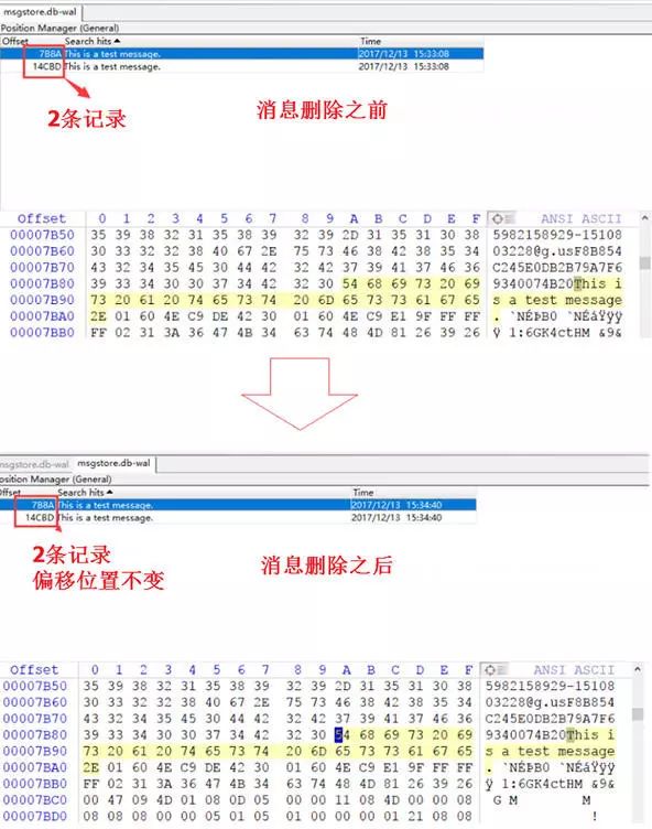但是,即使这样,这条消息仍有可能在缓存文件msgstore.db-wal中留有记录。下图展示了这条消息被删除后缓存文件发生的变化,可以看到消息的记录数据并未丢失,且其偏移位置都没有发生变化。