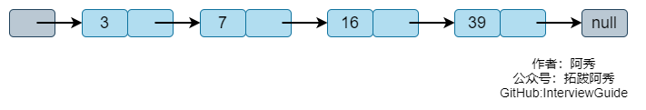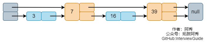从头节点的最顶层开始,先到节点7。 7的下一个节点是39,大于16,因此我们退回到7 从7开始,在下一层继续查找,就可以找到16。