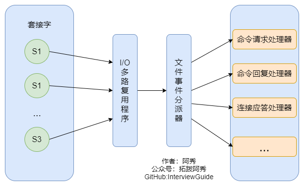 多个 socket IO多路复用程序 文件事件分派器 事件处理器(连接应答处理器、命令请求处理器、命令回复处理器)