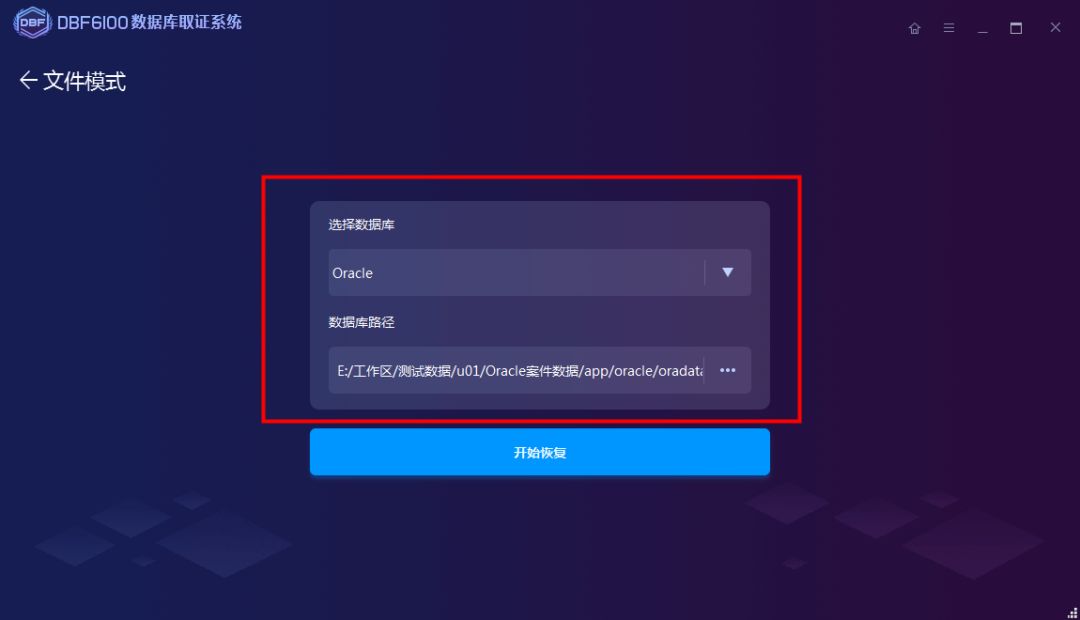 2、选择「数据库类型」及「数据库路径」,点击「开始恢复」按钮进行数据恢复;