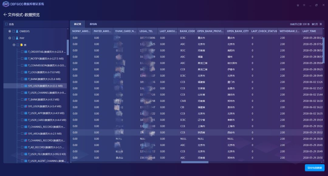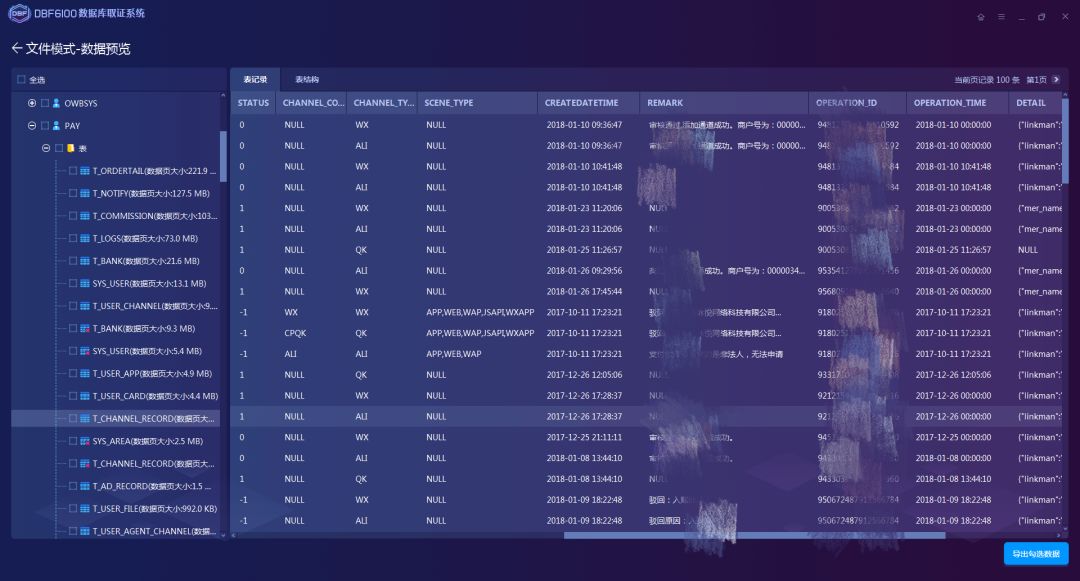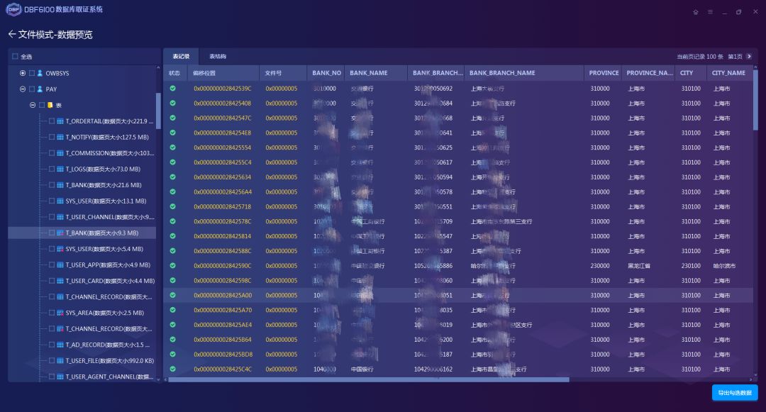 DBF6100支持不依赖数据库环境,不需要数据库登录密码,直接对磁盘、镜像等数据源进行快速扫描,实现对数据库文件的快速提取。