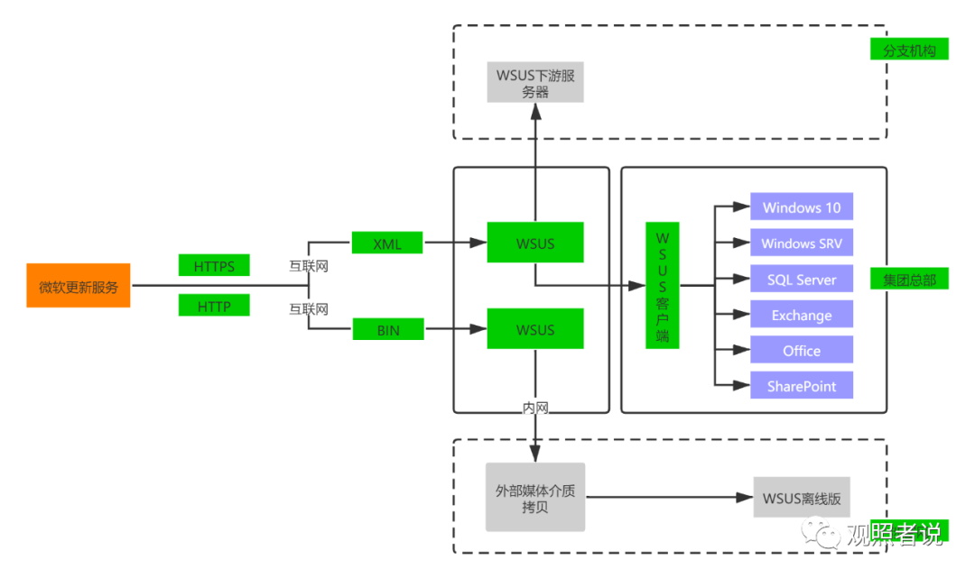 。通过WSUS可以大大提高IT的运维效率,减少因为紧急补丁带来的加班工作量。下面是我画的一个架构图,简单解释一下: