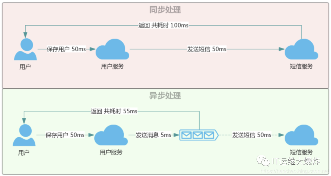同步处理:注册流程共耗时=保存用户50ms+短信通知50ms=100ms