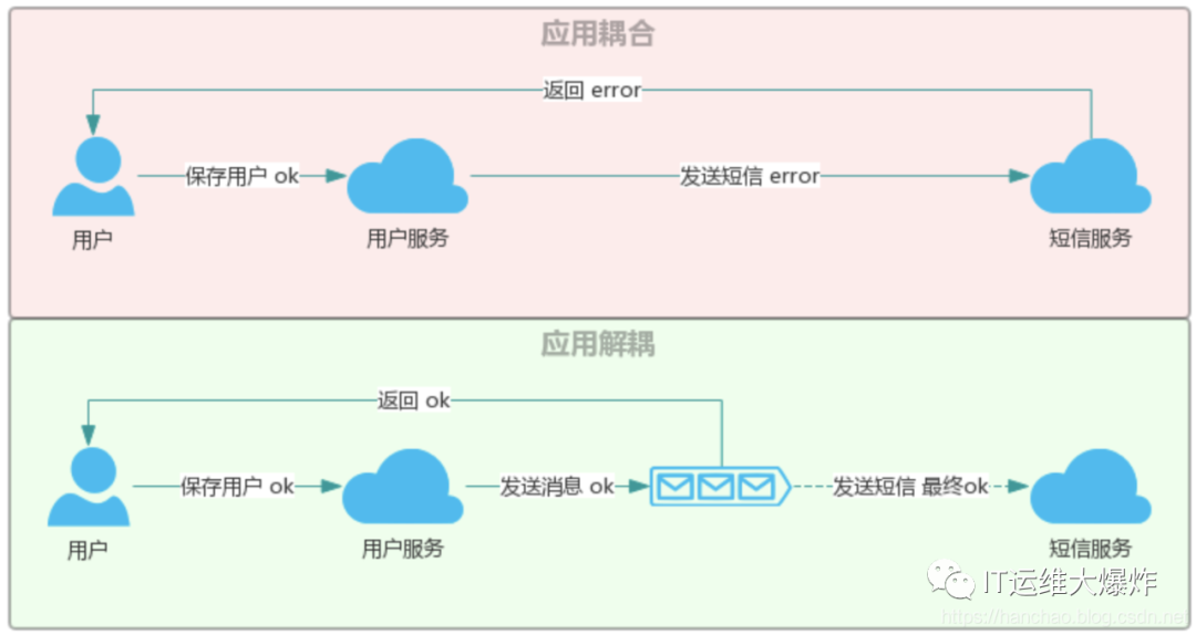 应用耦合的情况下,如果短信服务发送故障,则整个注册功能都将不可用。应用解耦的情况下,即使短信服务发送故障,注册功能也能继续提供服务。