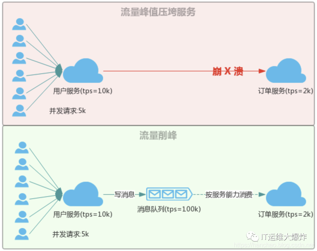 未削峰:秒杀请求峰值为5k,而订单服务的最大吞吐量只有2k,这种情况下定会压垮订单服务。削峰:秒杀请求峰值为5k,MQ的最大吞吐量为100k,处理这些请求绰绰有余;订单服务以2k的速度处理MQ中的请求,服务不会崩溃。