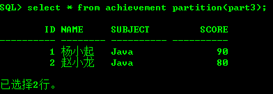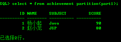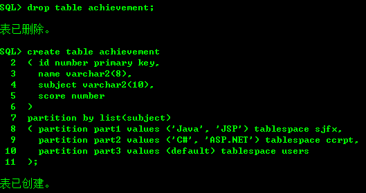 上面使用PARTITION BY LIST子句,指定按表ACHIEVEMENT中的SUBJECT列进行列表分区。
