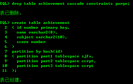 上面使用PARTITION BY HASH子句,指定按表ACHIEVEMENT中的ID列进行散列分区。