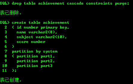 上面在创建表ACHIEVEMENT时,使用PARTITION BY RANGE子句指定按SCORE列进行范围分区,并按照值的大小将表分为3个区,分别为part1、part2和part3。如果不指定分区名,Oracle将自动对分区进行命名。