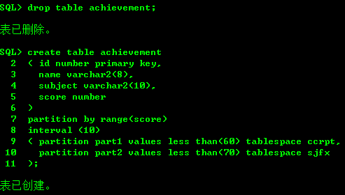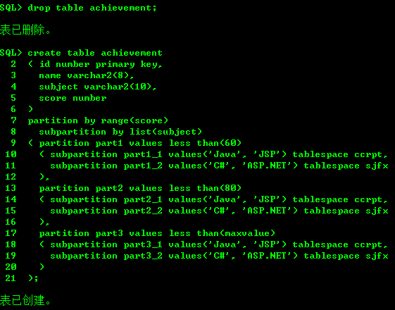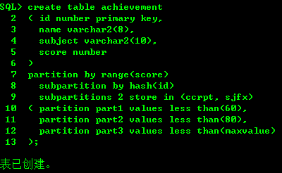 例如,创建一个表ACHIEVEMENT,按SCORE列进行进行范围分区,再按ID列进行散列分区,如下: